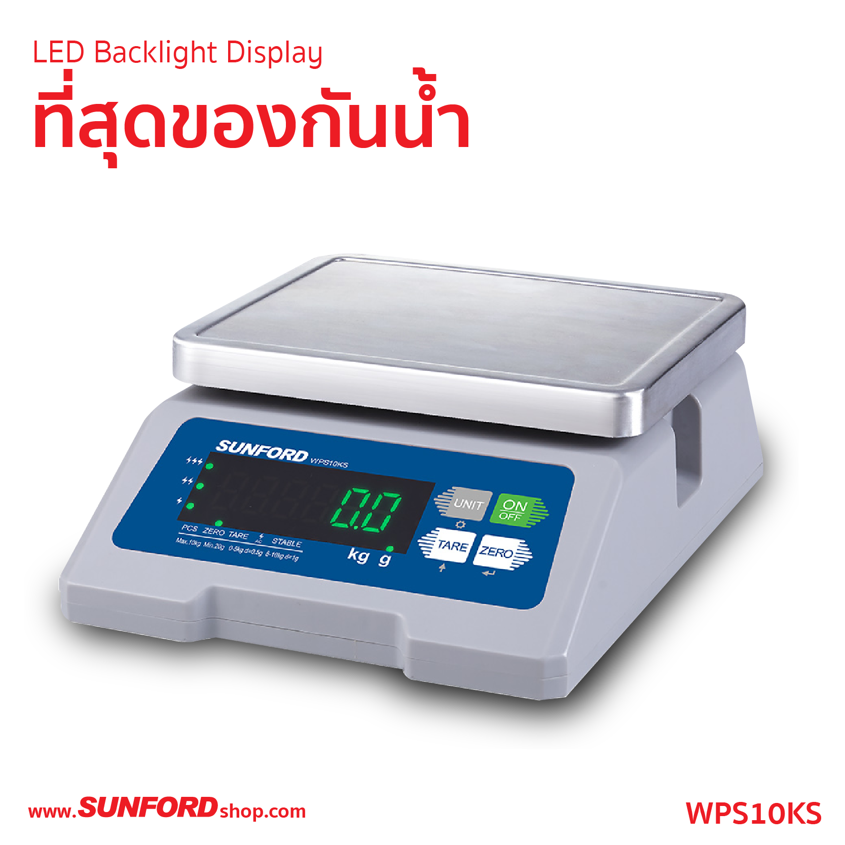 พิกัดน้ำหนัก 10 กิโลกรัม (10000 กรัม) น้ำหนักชั่งขั้นต่ำ 4 กรัม