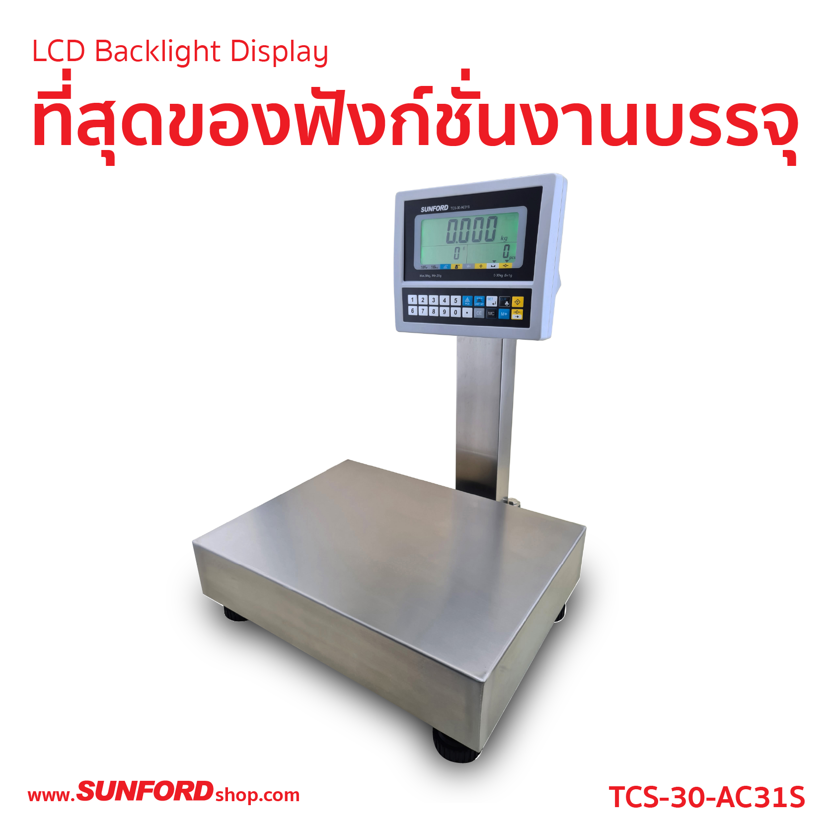 พิกัดน้ำหนัก 30.00 กิโลกรัม แสดงน้ำหนัก 0.000-30.000 กิโลกรัม ค่าละเอียด 0.001 กิโลกรัม (1 กรัม) ขนาดจานแท่นชั่ง กว้าง 30.0 เซนติเมตร x ยาว 40.0 เซนติเมตร x สูง 8.0 เซนติเมตร เสาเครื่องสแตนเลส