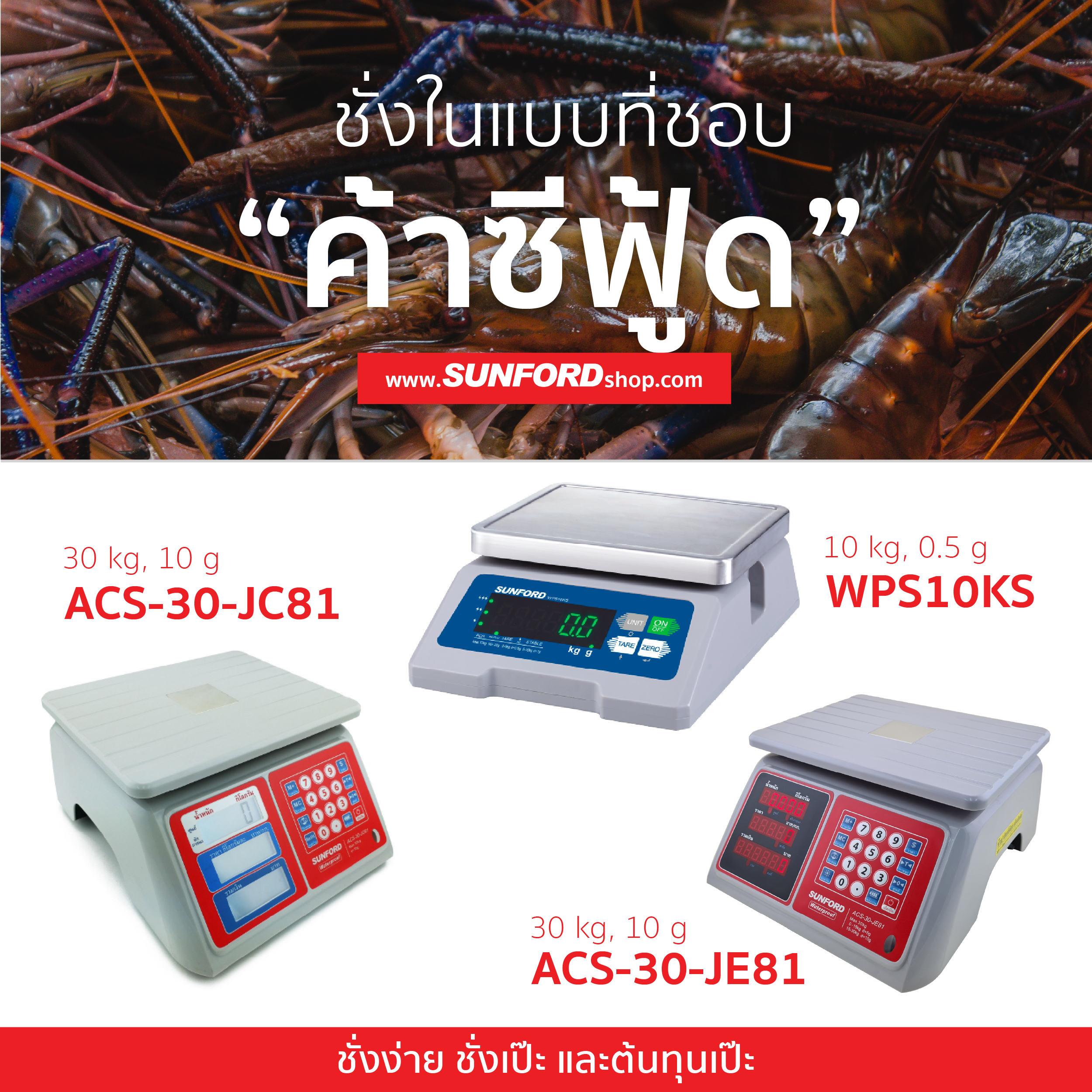 ใหม่!! ขอแนะนำ SUNFORD WPS10KS0 สุดยอดเครื่องชั่งกันน้ำกันฝุ่น พร้อมหน้าจอสว่าง เห็นตัวเลขชัด แบตอึดทนทาน ใช้งานได้ไม่มีสะดุด จะงานครัวหนักแค่ไหนไม่ต้องกังวลว่าเครื่องจะพัง จานชั่งสแตนเลสอย่างหนา ไร้สนิม มีใบรับรองใช้ชั่งซื้อขายได้ ถูกกฏหมาย