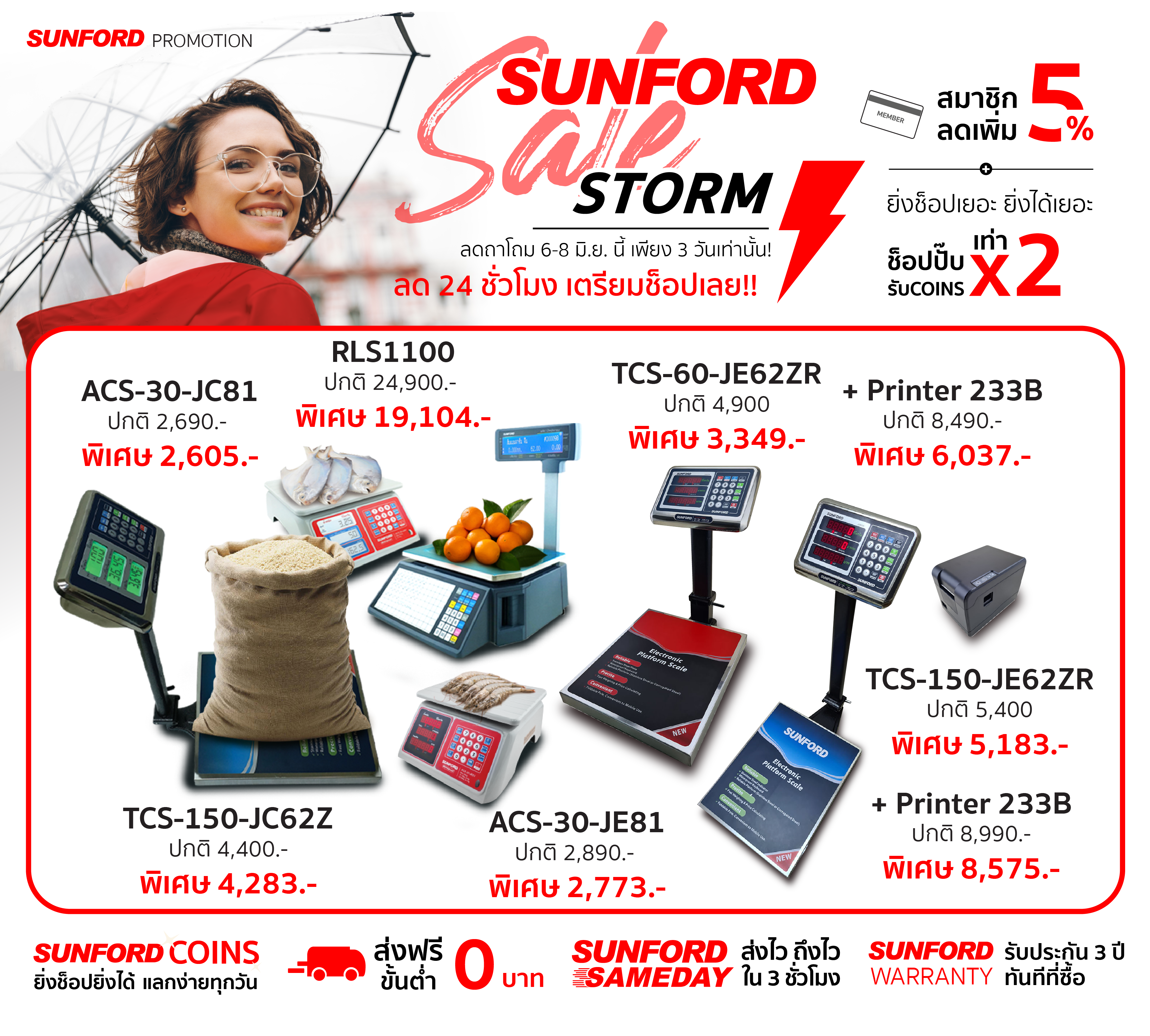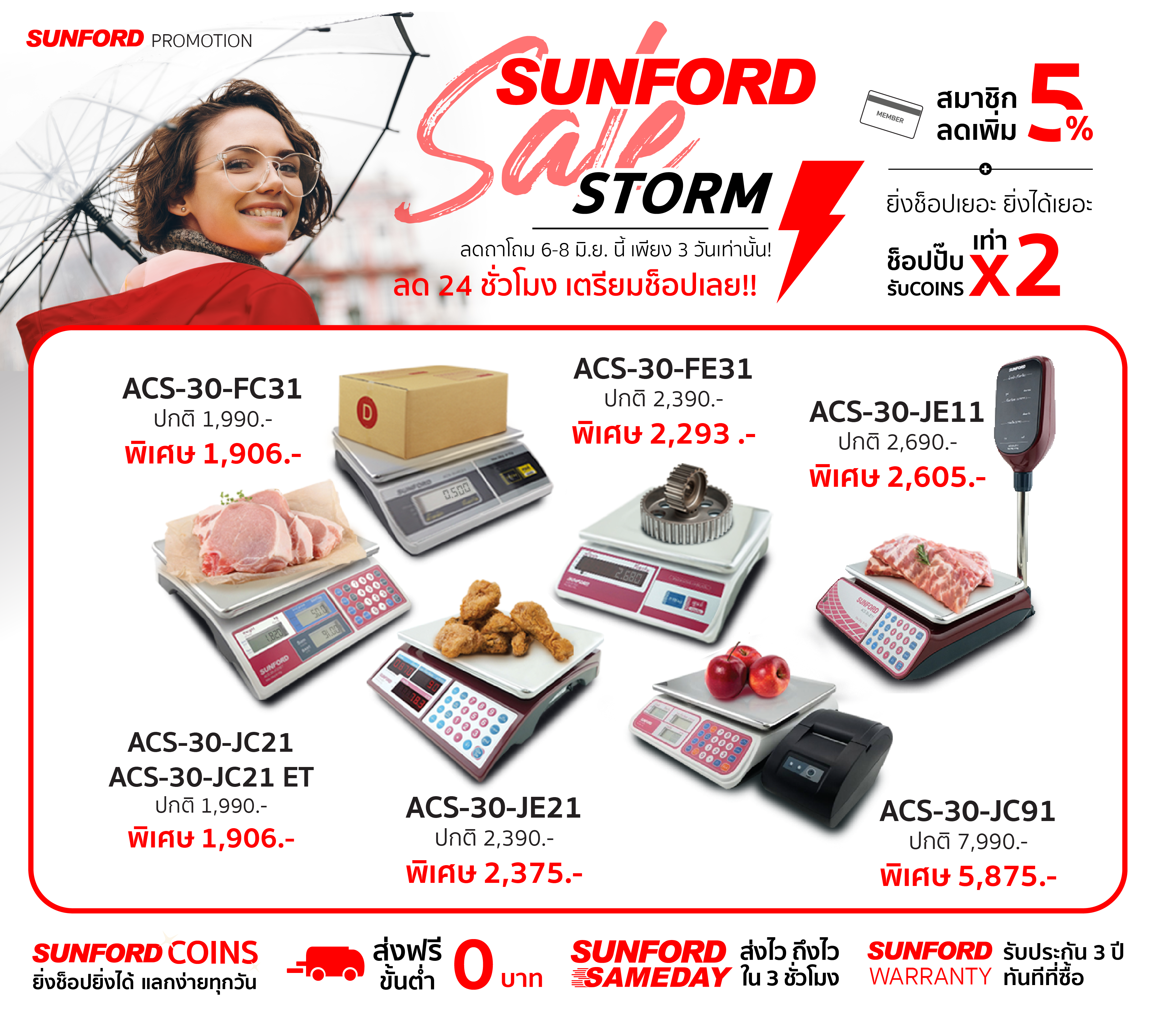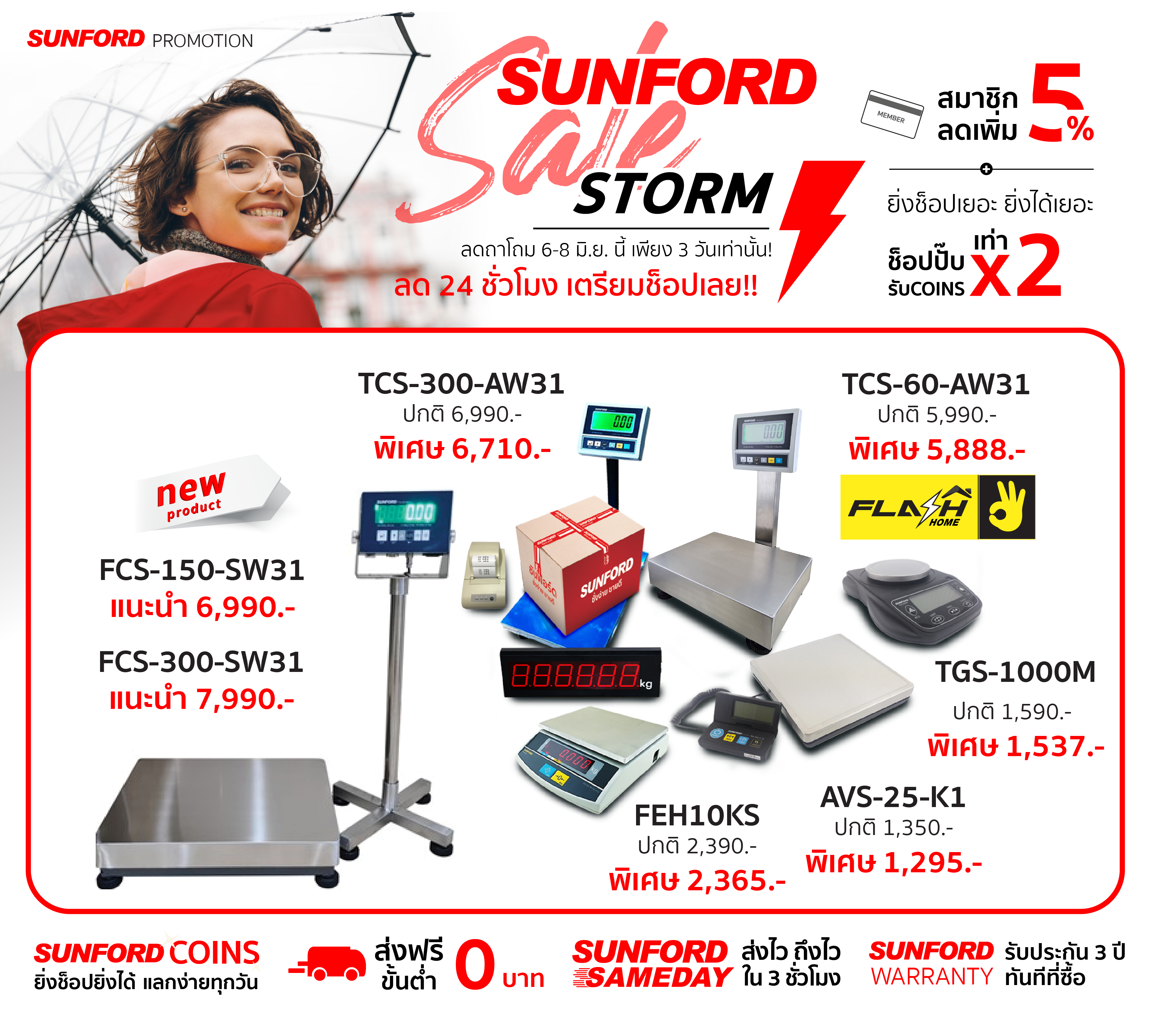 โดยคาดการณ์ว่าโปรที่จัดขึ้นกลางปี ฝ่ามรสุมแบบนี้ จะมีกำลังแรงมากด้วยอิทธิพลของ #SUNFORDSaleStorm จึงขอประกาศเตือนเพื่อไม่ให้ทุกคนพลาดโปรนี้!