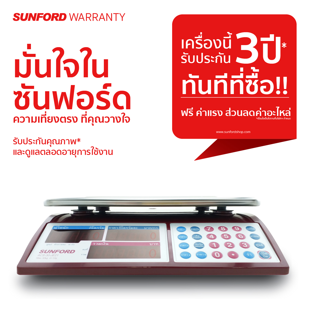 มั่นใจผลิตภัณฑ์ #เครื่องชั่งดิจิตอล หนึ่งในแบรนด์ไทย หัวใจไทยเพื่อคนไทย ยืนหนึ่งเรื่องงานชั่ง #สายค้าขาย #สายผลิต #สายครัว กับ #SUNFORD การันตี 36 เดือนทันทีที่ซื้อ และดูแลตลอดอายุการใช้งาน
