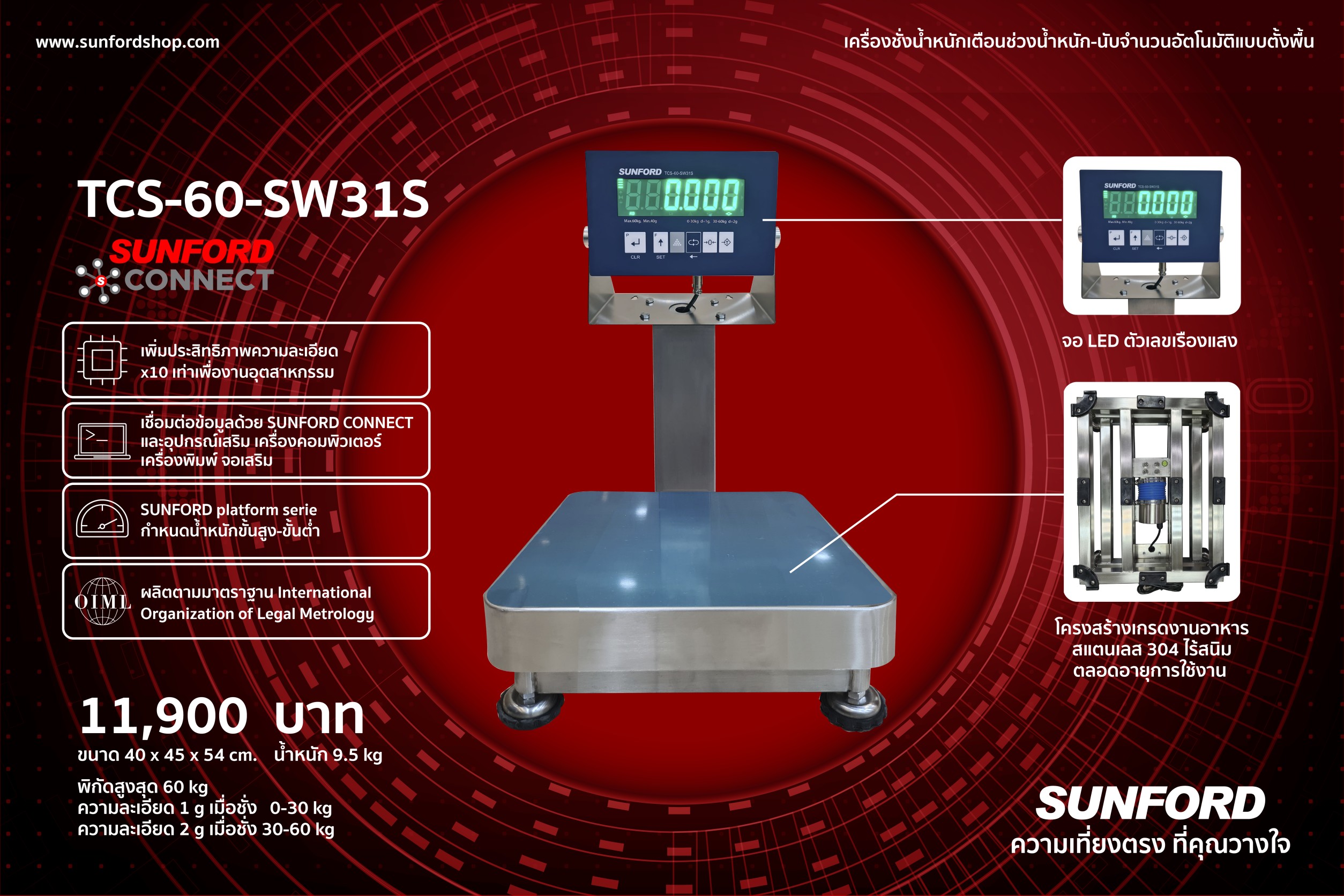 SUNFORD TCS-60-SW31S เครื่องชั่งน้ำหนัก เตือนช่วงน้ำหนัก-นับจำนวนอัตโนมัติแบบตั้งพื้น สเปคแรง ราคาแนะนำ 11,900 บาท